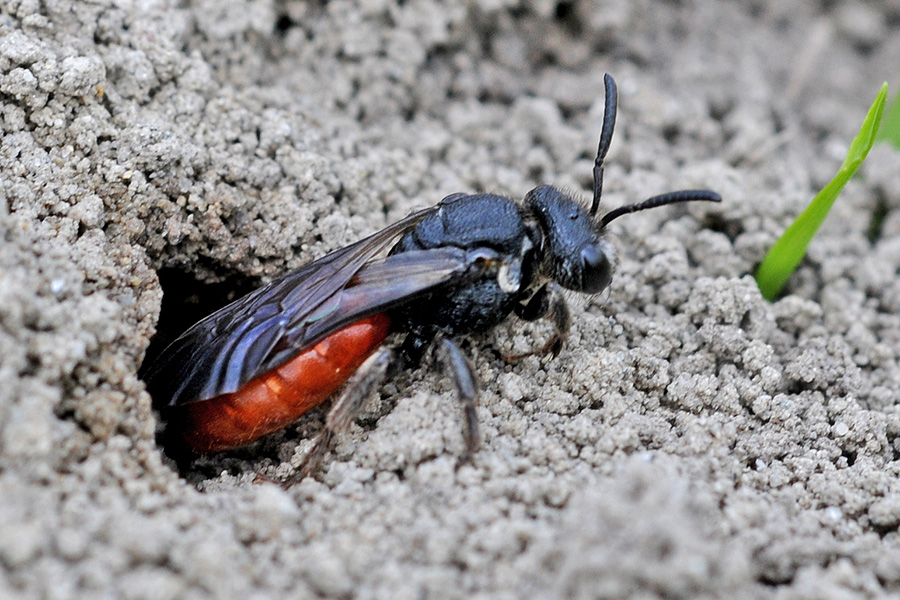 Große Blutbiene (Sphecodes albilabris), W, das Nest der Frühlings-Seidenbiene (Colletes cunicularis) verlassend246.7 K -