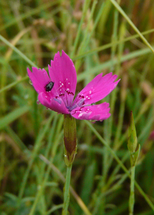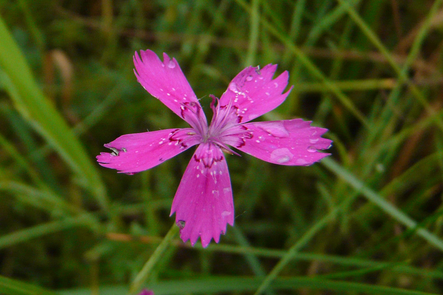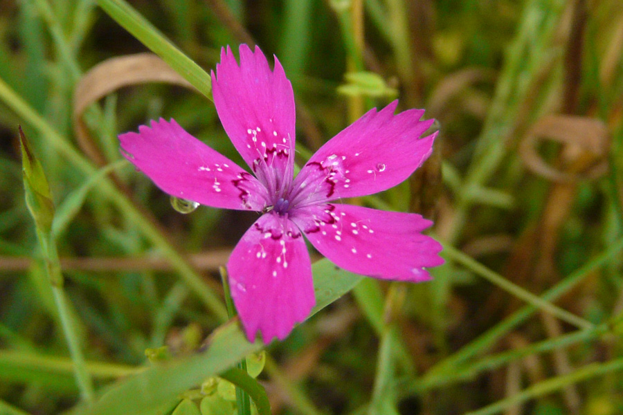 Die Heide-Nelke (Dianthus deltoides) blüht von Juni bis Sept., die Blüten stehen einzeln, sind purpurrot mit weißen Punkten und dunklen Ring.