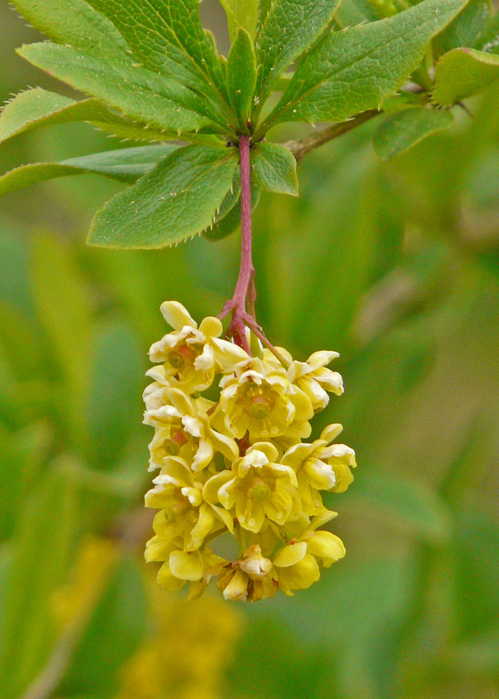 Die Blüten sind gelb, in hängenden Trauben. Die länglichen Beeren sind rot.
