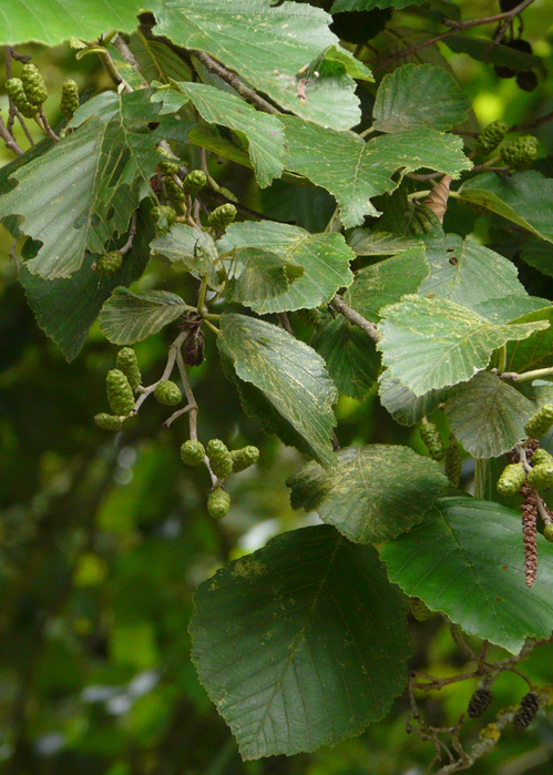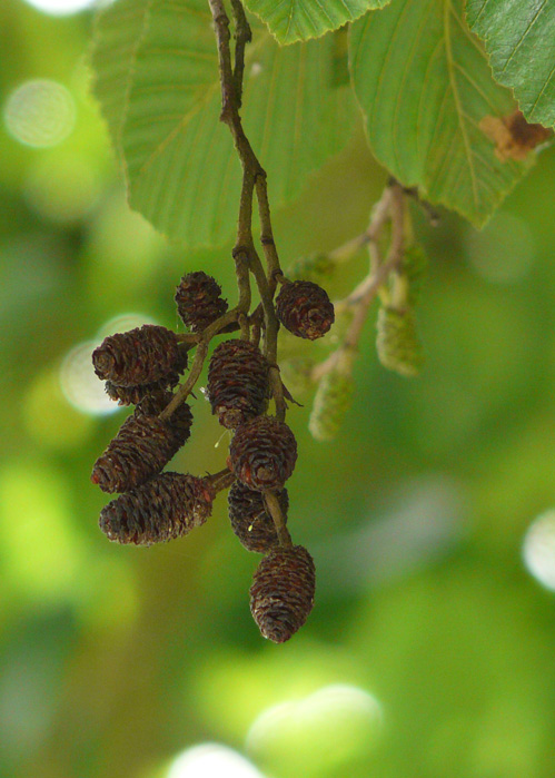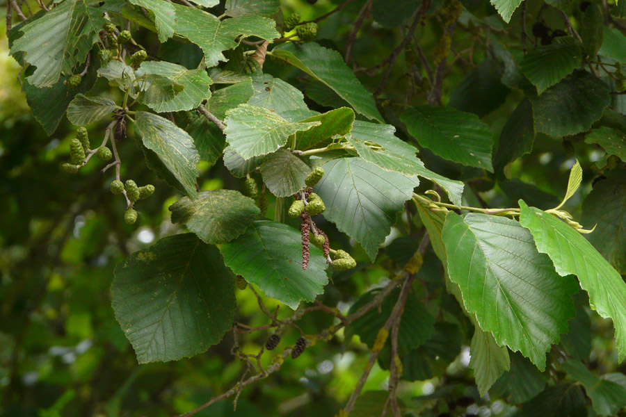 Die Grau-Erle (Alnus incana) hat ihren Namen von den Blättern, die an der Unterseite grau sind. Die elliptischen Blätter haben eine Spitze, anfangs sind sie dicht behaart und später haben sie nur noch an den Blattnerven die Behaarung.