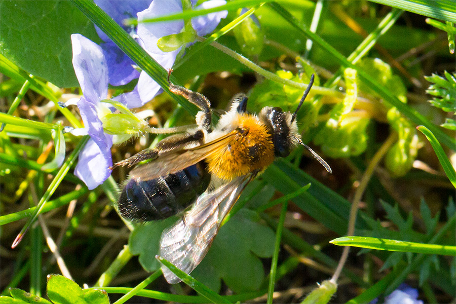 Nistweise: Ihre Nester legt das Weibchen einzeln an wenig bewachsenen sandigen oder lehmigen Stellen an. Gerne auch in Rasenflächen (Foto).