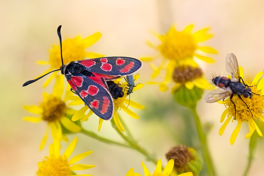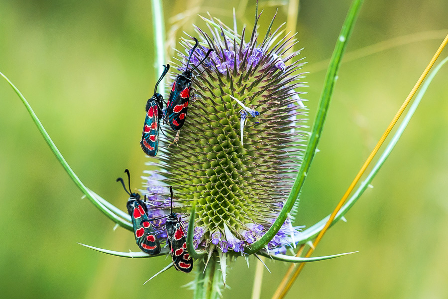 Das eher seltene Esparsettenwidderchen (Zygaena carniolica), auch Krainer Widderchen genannt, gehört zu den Nachtfaltern, ist aber tagaktiv. Es gilt laut Roter Liste D, ebenso wie in Bayern,  als gefährdet. Die auffälligen Signalfarben signalisieren seine Giftigkeit. In der Abendzeit versammeln sich die Esparsettenwidderchen gerne an den Spitzen von höher aufragenden Pflanzen, um dort gemeinsam die Nacht zu verbringen.