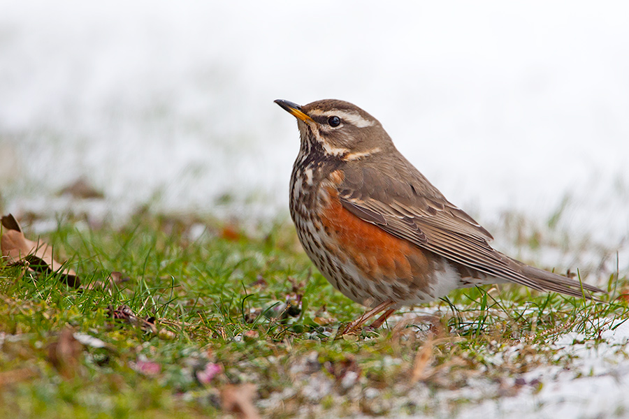 Die Rotdrosse ähnelt der Singdrossel, ist aber an der roten Flügelunterseite und dem hellen Überaugenstreif gut zu unterscheiden.