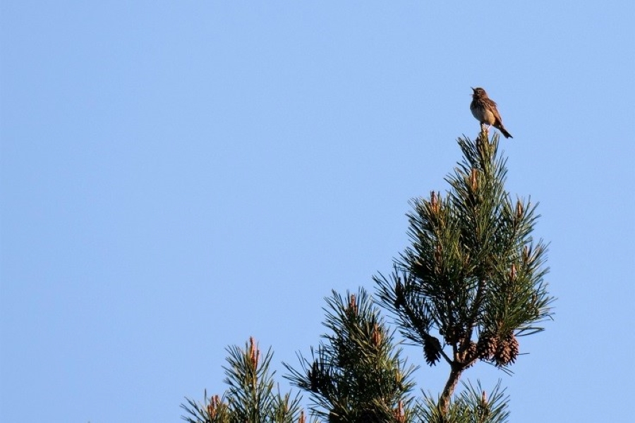 Heidelerche 1 Ind. zog um 16:00 Uhr zog einem Wellenflug seine Kreise über dem Bayerischen LfU und sang sein dudelndes Lied.